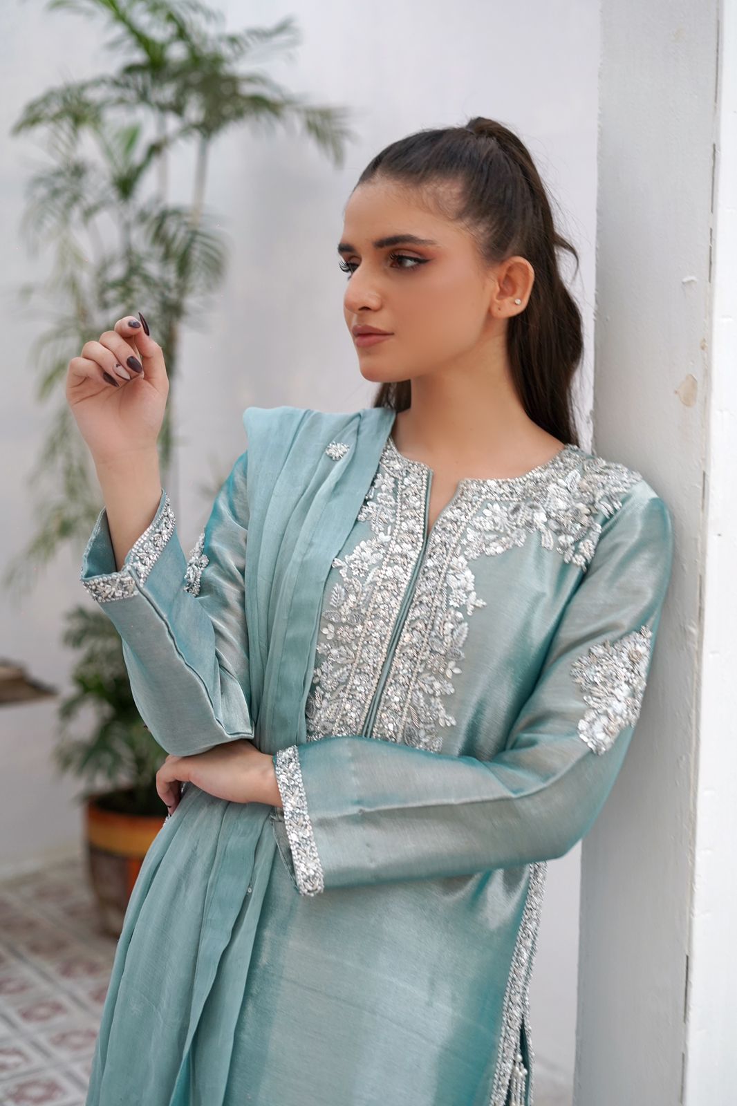 Step into effortless sophistication with Ayzel, a masterpiece in serene aqua blue. Crafted from lustrous fabric that drapes gracefully, this outfit features exquisite silver threadwork and shimmering embellishments adorning the neckline, sleeves, and side panels. The delicate embroidery blooms like frost-kissed florals, adding a touch of luxury to every detail.