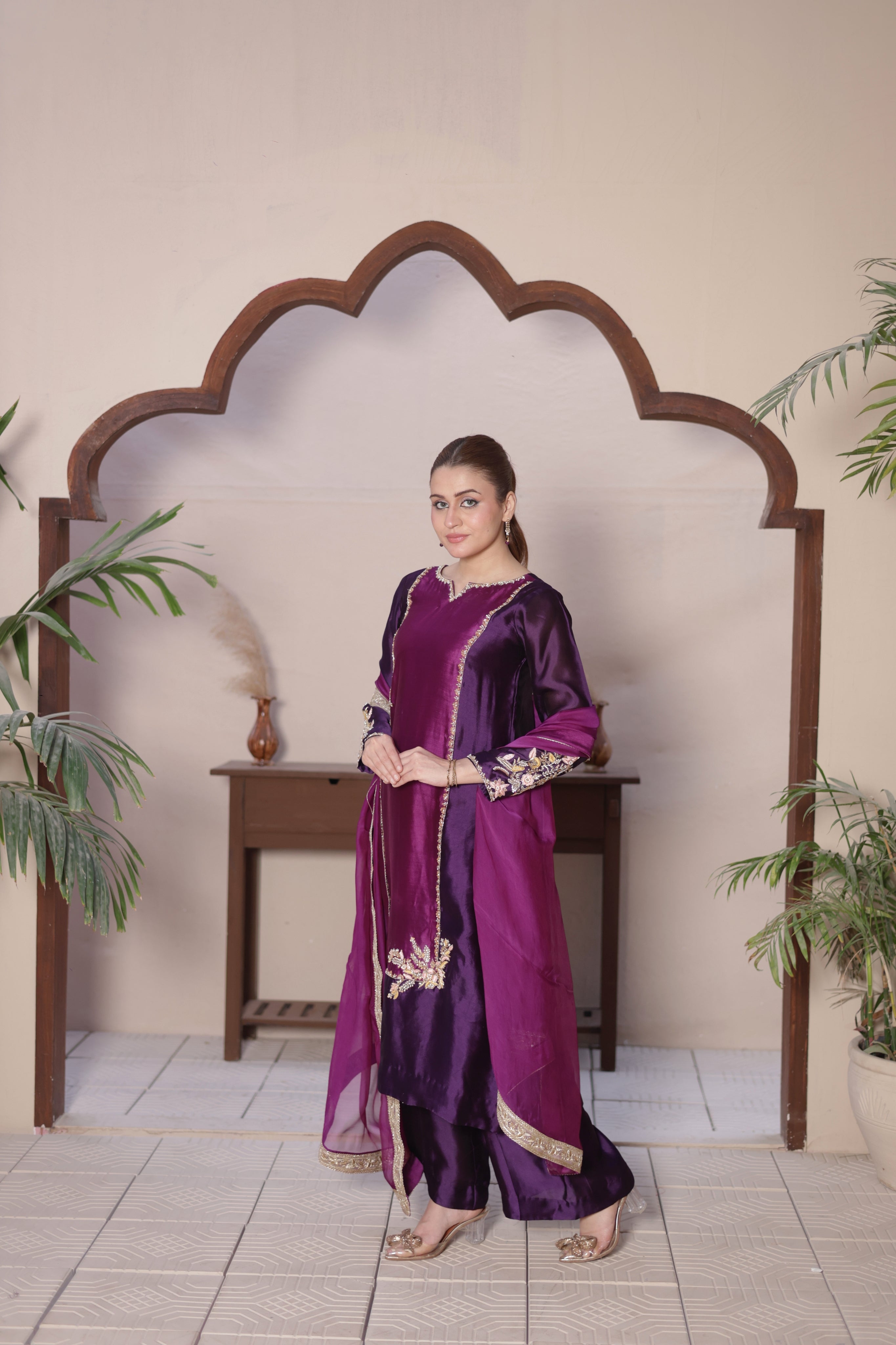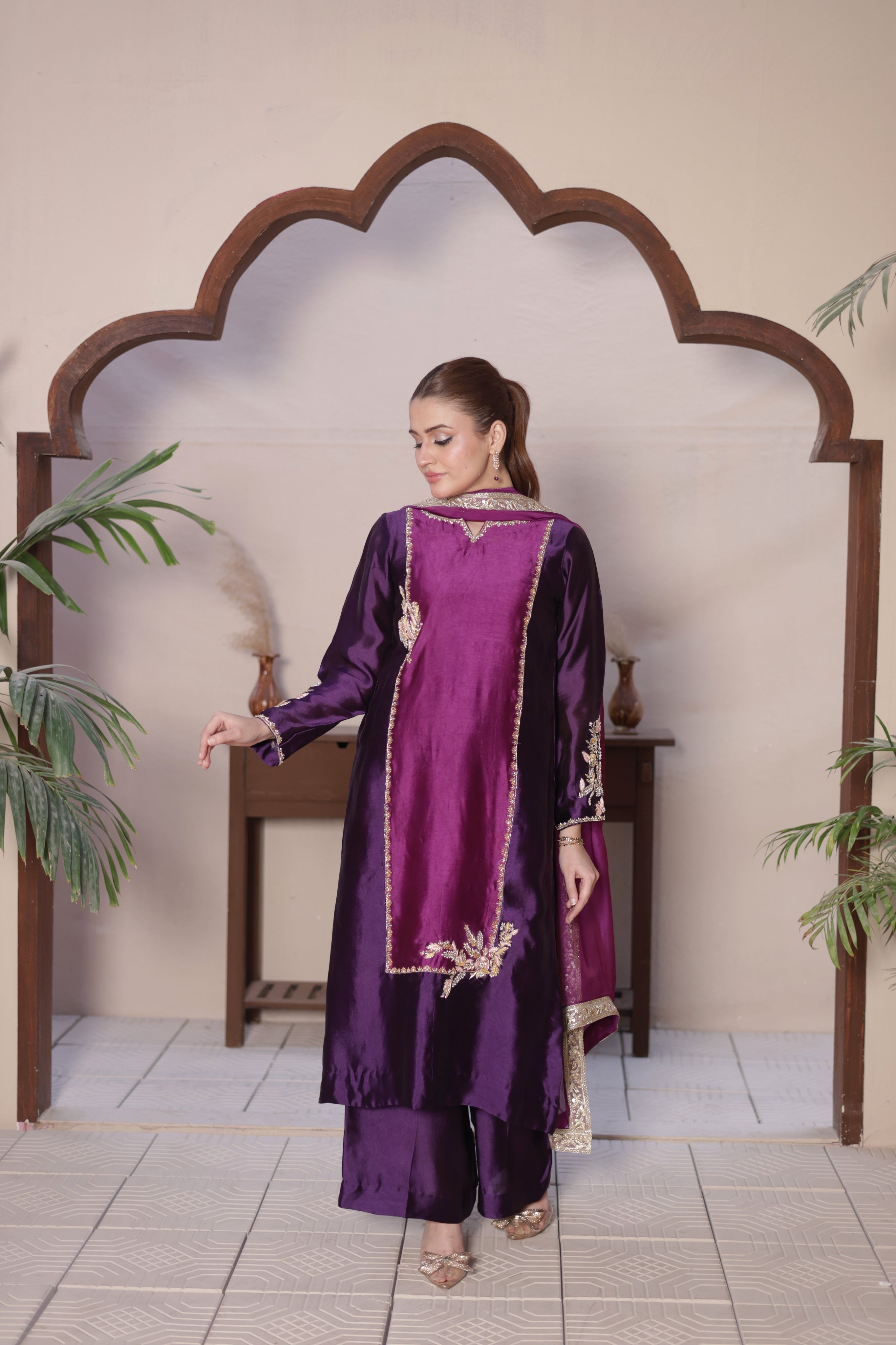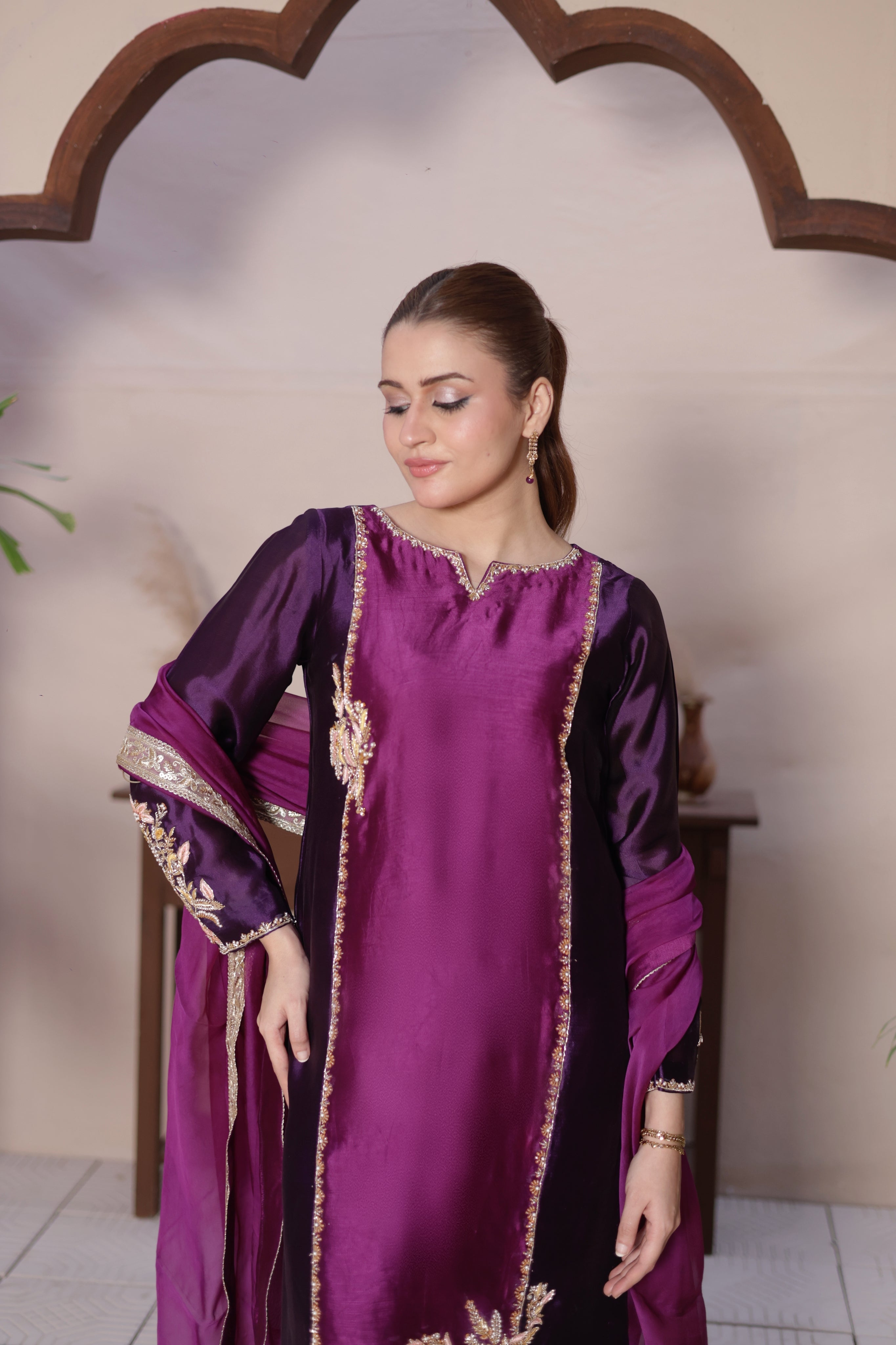 Nureh is crafted in lustrous plum shisha silk featuring a contrasting center panel that runs down the front, framed with fine gold embellishment. The neckline is finished with delicate detailing, while subtle floral motifs are placed on the front and sleeves for a balanced, refined look. The straight silhouette and clean tailoring give the outfit a structured yet graceful fall. Paired with matching wide-leg silk trousers and a coordinating dupatta accented with a gold border. The combination of the center panel and minimal, well-placed embellishment makes this piece ideal for festive occasions, wedding events, and formal gatherings.